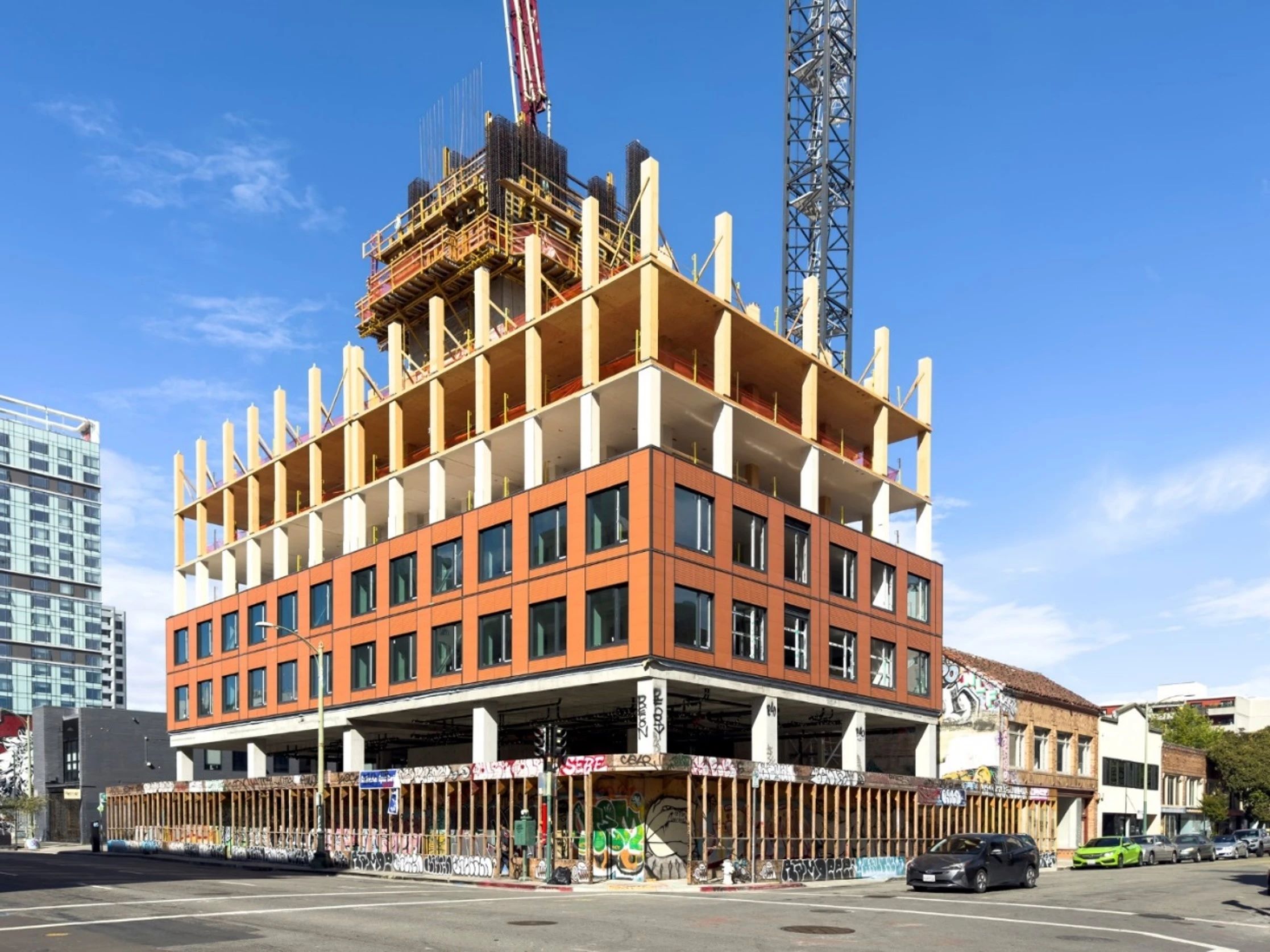 奥克兰有全球第一栋用巨型胶合板建造的19层高层公寓,结构形式与加拿大学生公寓相似,以两个电梯井为核心筒,柱子和楼板采用巨型胶合板,中间用金属连接线连接,施工速度快,外墙全预制。